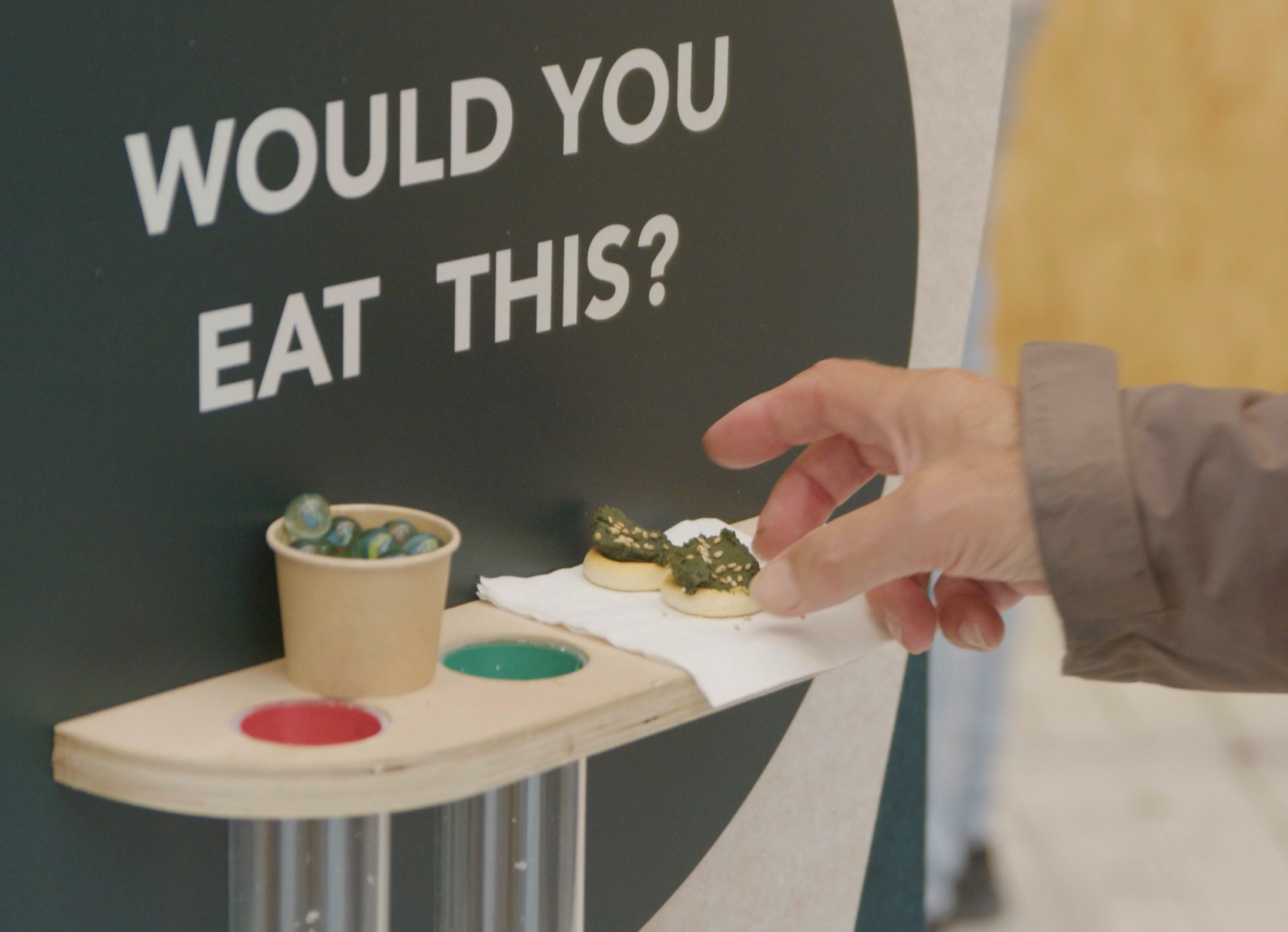 Tijdens de Floriade proefden bezoekers microbiële hapjes zoals algentapenade en winegums. De visie: steden kunnen in de toekomst (deels) worden gevoed met voedingsrijke microben, gekweekt in systemen zoals LED-fotobioreactoren voor algen, geïntegreerd in keukens of gemeenschappelijke tuinen. https://vimeo.com/763312592?fl=pl&fe=vl